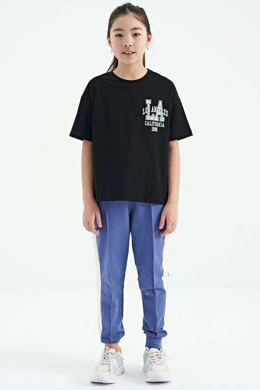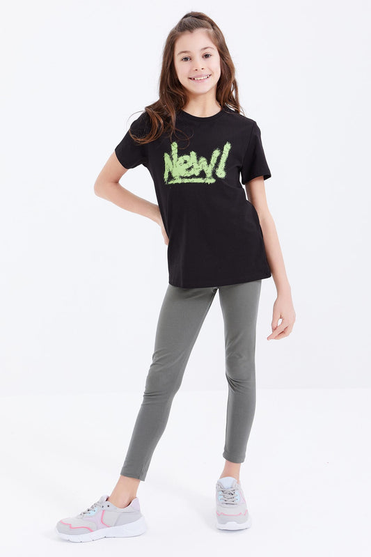 Black Basic Print O Neck Comfort Fit Girls' T-Shirt - 75041