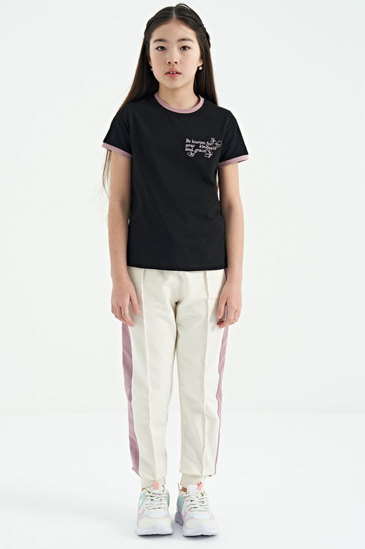 Black Minimal Print O Neck Comfort Fit Short Sleeve Girls T-Shirt - 75110