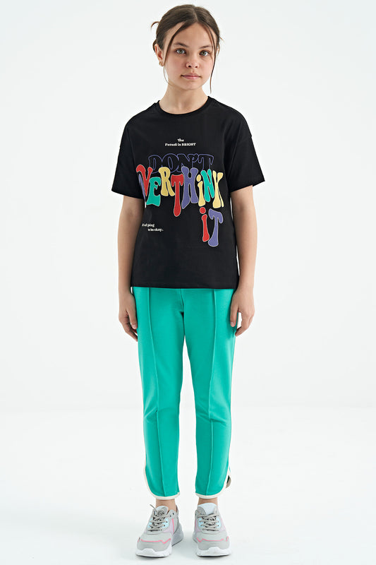Black Printed Text O Collar Oversize Short Sleeve Girls' T-Shirt - 75112