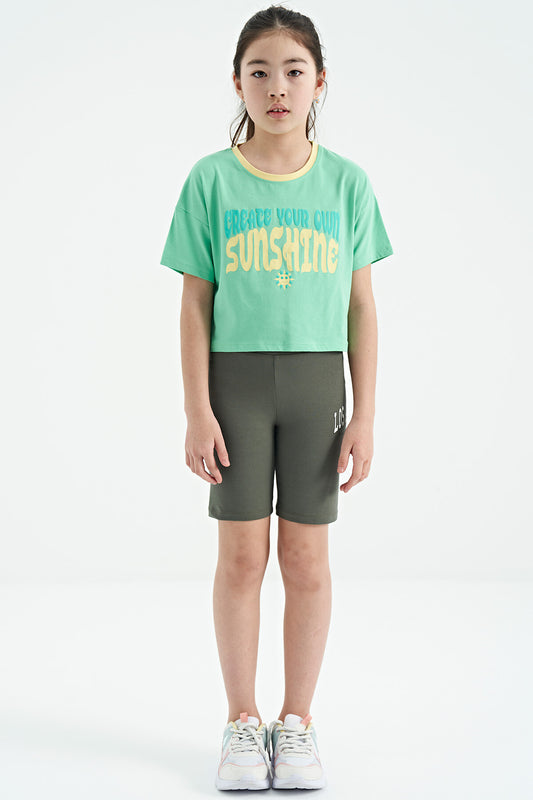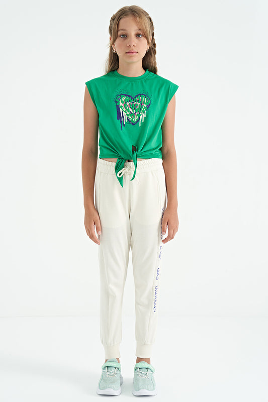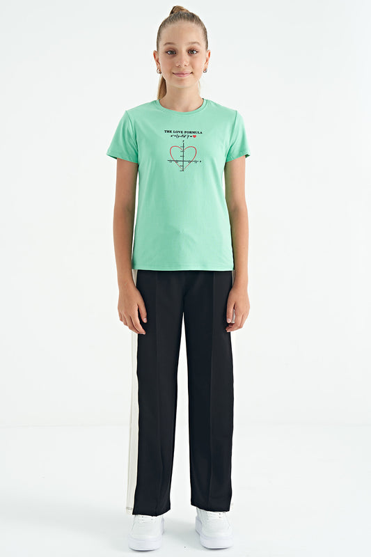 Green Heart Print Front Knot Detailed Comfortable Fit Girls T-Shirt - 75114