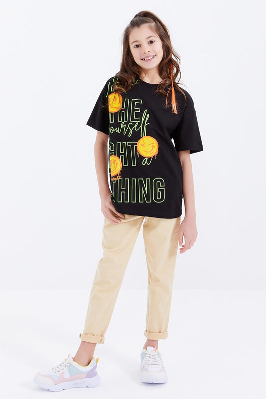 Black Oversize Emoji Print O Neck Drop Shoulder Girls' T-Shirt - 75042
