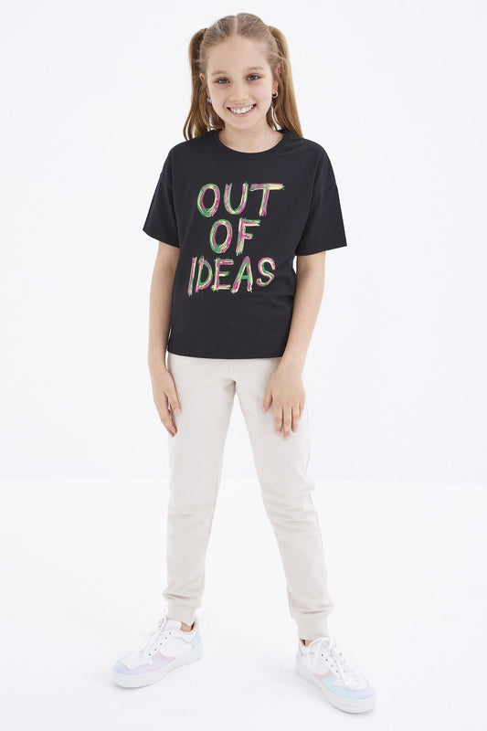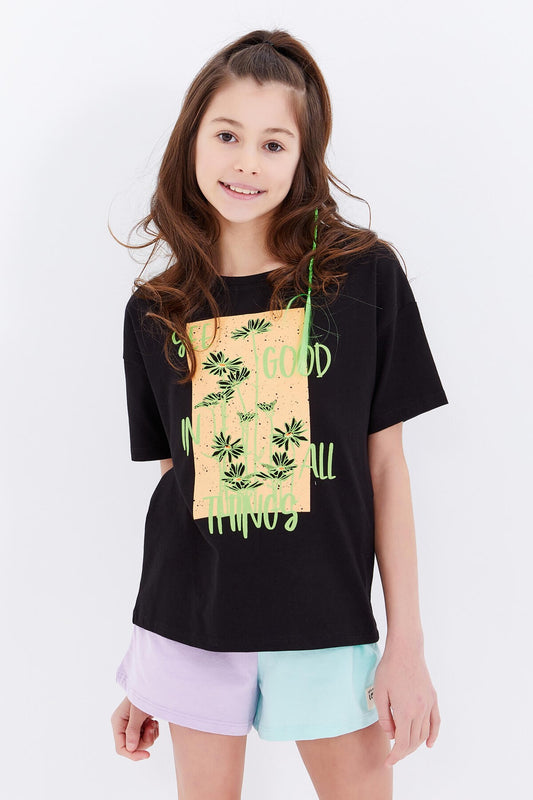 Black Oversize Print O Collar Drop Shoulder Girl's T-Shirt - 75028