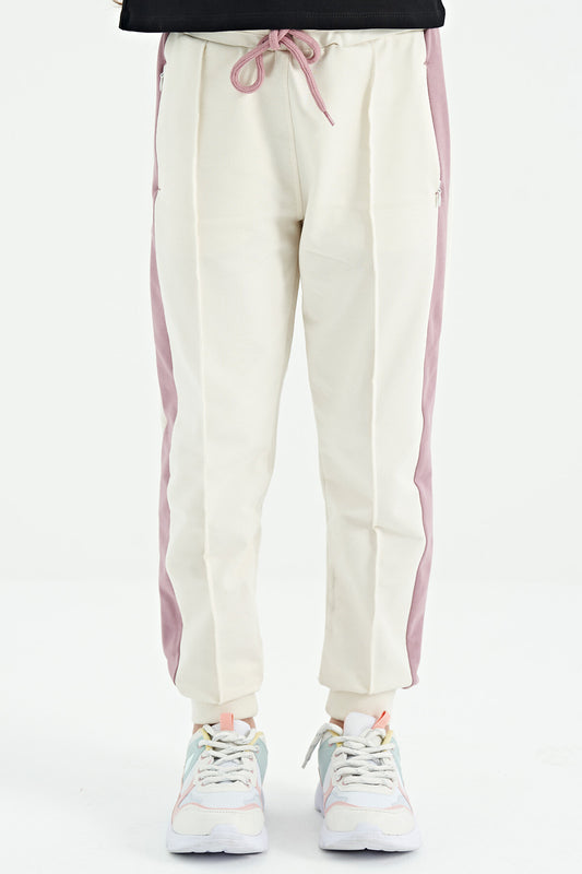 Ecru Beige Striped Hidden Zipper Pocket Detailed Jogger Girls Tracksuit Bottom - 75122