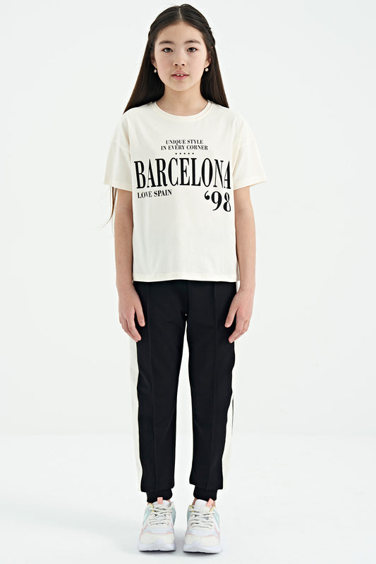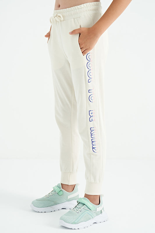 Ecru Off-White Embroidered Laced Standard Fit Jogger Girls' Tracksuit Bottom - 75123