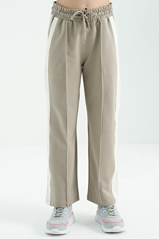 Dark Beige Side Striped Detailed Laced Relaxed Fit Wide Leg Girls' Tracksuit Bottom - 75119