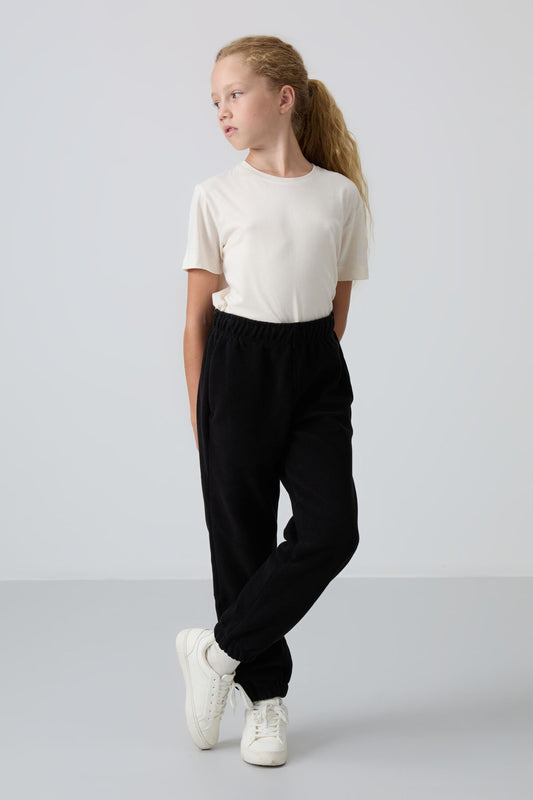 Black Thick Soft Textured Standard Fit Embroidered Fleece Girls' Tracksuit Bottom - 75155
