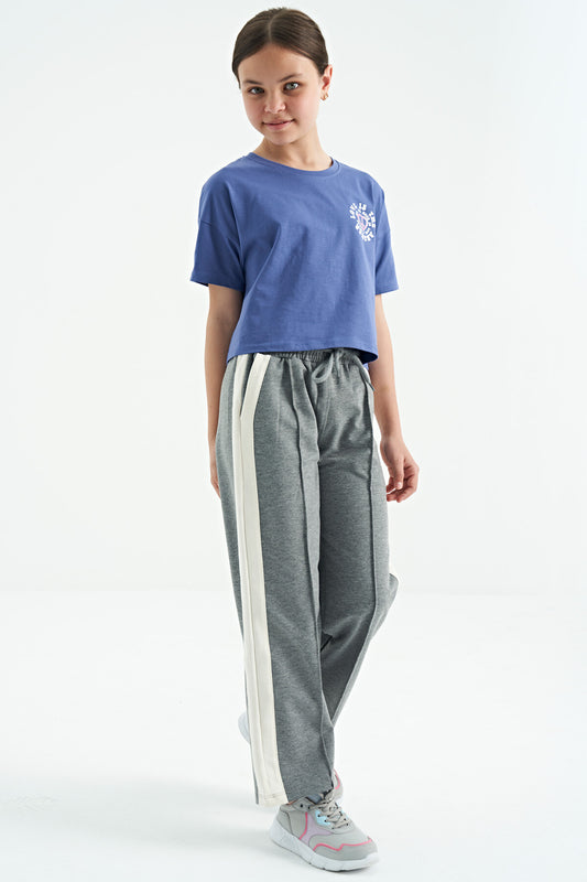 Gray Melange Ribbed Detailed Laced Relaxed Fit Wide Leg Girls' Tracksuit Bottom - 75119