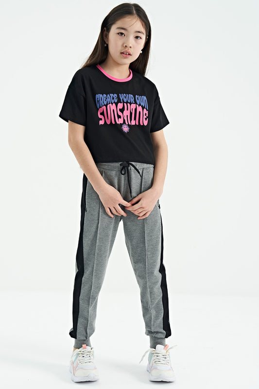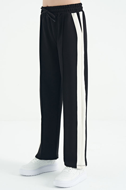 Black Side Striped Detailed Laced Relax Fit Wide Leg Girls' Tracksuit Bottom - 75119