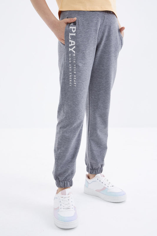 Grey Melange Print Embroidered Laced Standard Fit Elastic Hem Girls' Tracksuit Bottom - 75051