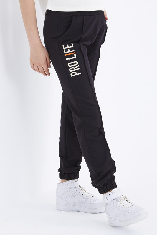 Black Embroidered Laced Standard Fit Elastic Cuff Girls' Tracksuit Bottom - 75050