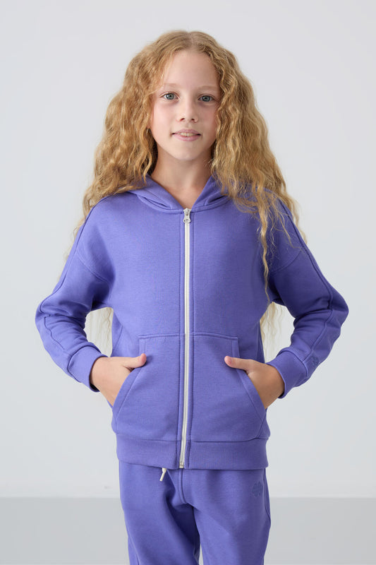 Light Blue Cotton Fleece-Lined Soft Textured Oversize Embroidered Girls' Tracksuit Set - 75145