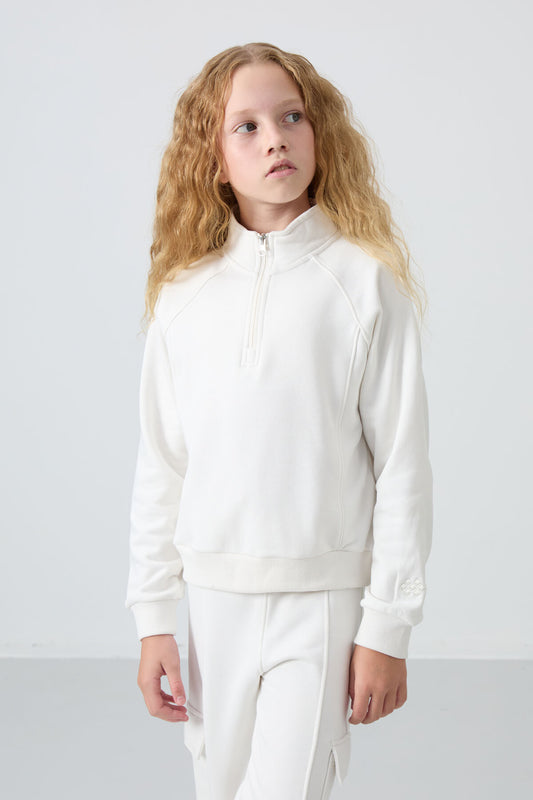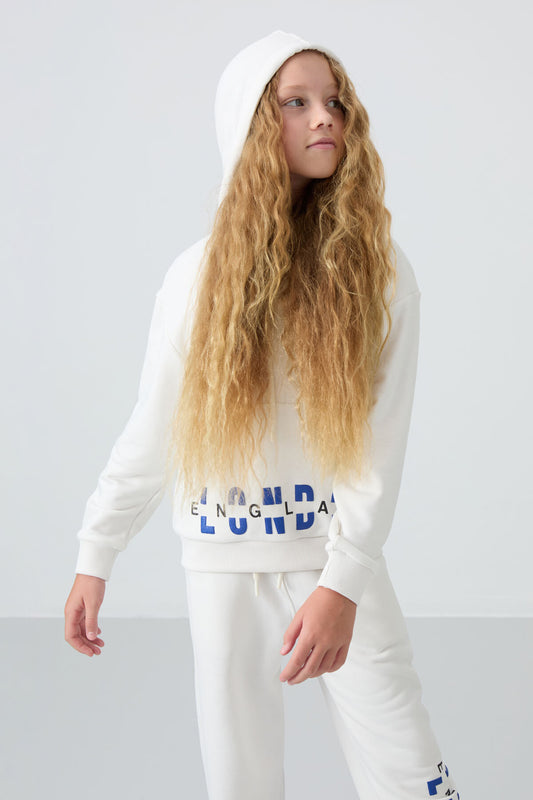 Ecru Cotton Fleece-Lined Soft Textured Oversize Printed Girls' Tracksuit Set - 75147