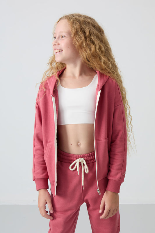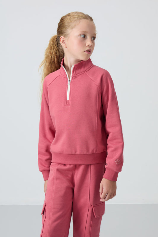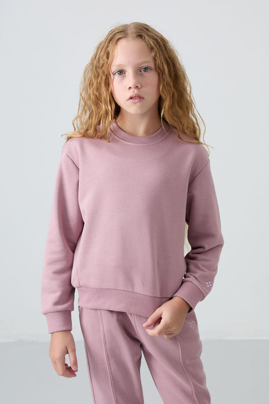 Dried Rose Cotton Fleece-Lined Soft Textured Oversize Embroidered Girls' Tracksuit Set - 75145