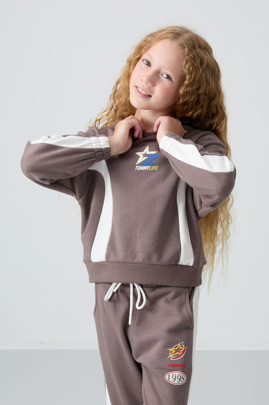 Dark Beige Cotton Fleece-Lined Soft Textured Standard Fit Embroidered Girls' Tracksuit Set - 75161