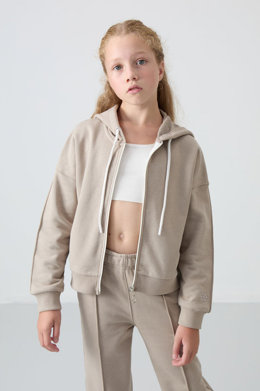 Light Beige Cotton Fleece-Lined Soft Textured Standard Fit Embroidered Girls' Tracksuit Set - 75159