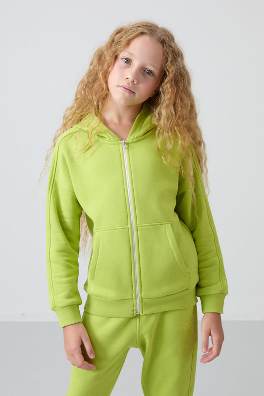 Lime Green Cotton Fleece-Lined Soft Textured Standard Fit Embroidered Girls' Tracksuit Set - 75148