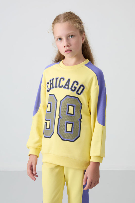 Yellow Cotton Fleece-Lined Soft Textured Standard Fit Printed Girls' Tracksuit Set - 75170