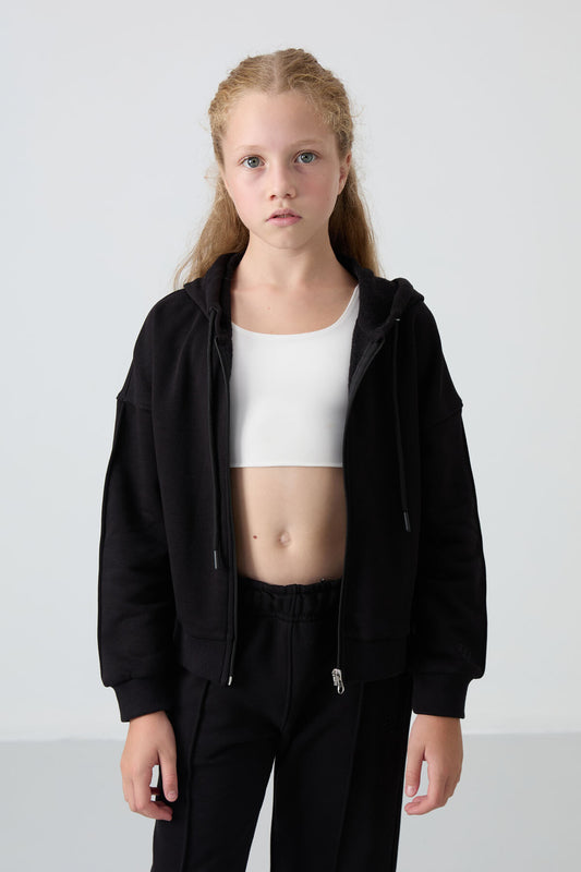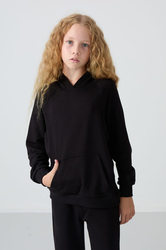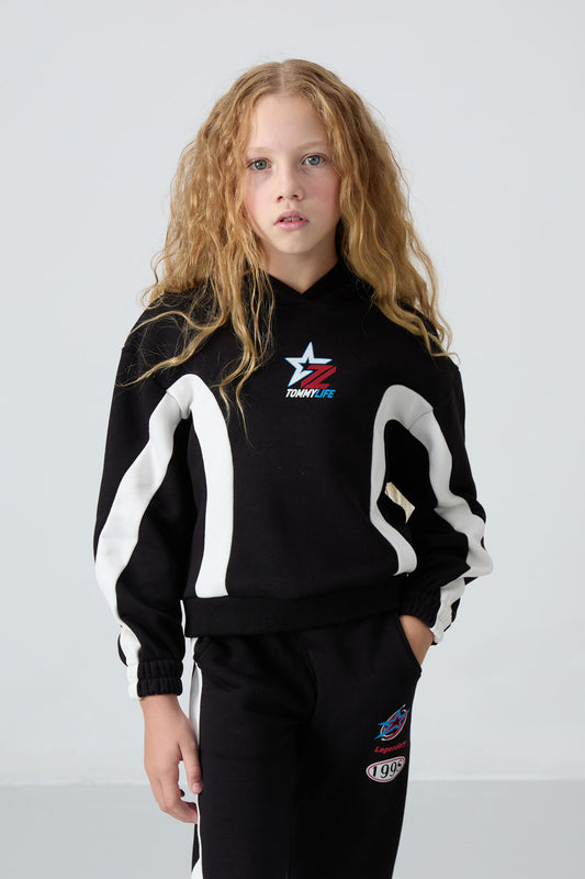 Black Cotton Fleece-Lined Soft Textured Oversize Embroidered Girls' Tracksuit Set - 75145