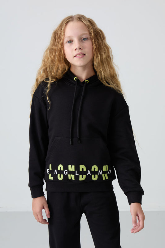 Black Cotton Fleece-Lined Soft Textured Oversize Printed Girls' Tracksuit Set - 75147