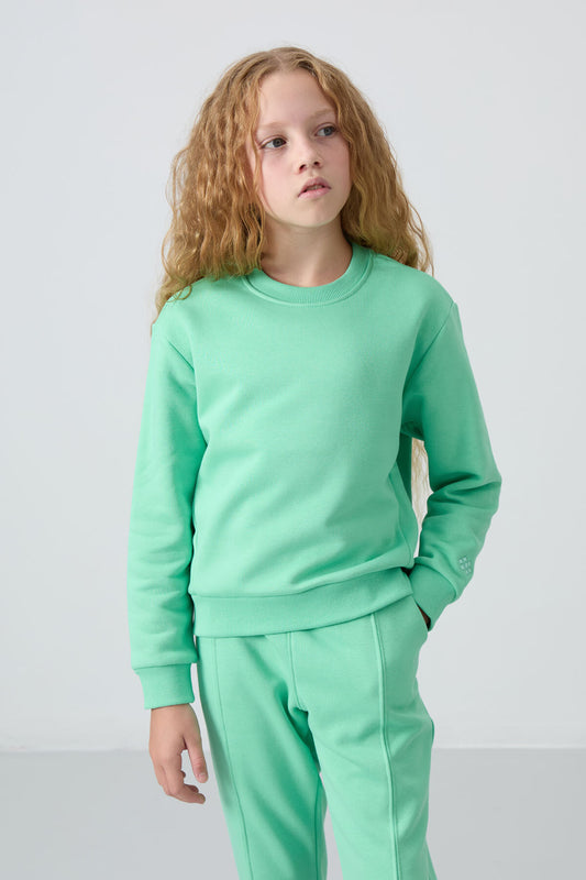 Light Green Cotton Fleece-Lined Soft Textured Oversize Embroidered Girls' Tracksuit Set - 75145
