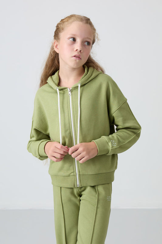 Oil Green Cotton Lined Fleece Soft Textured Standard Fit Embroidered Girls' Tracksuit Set - 75161