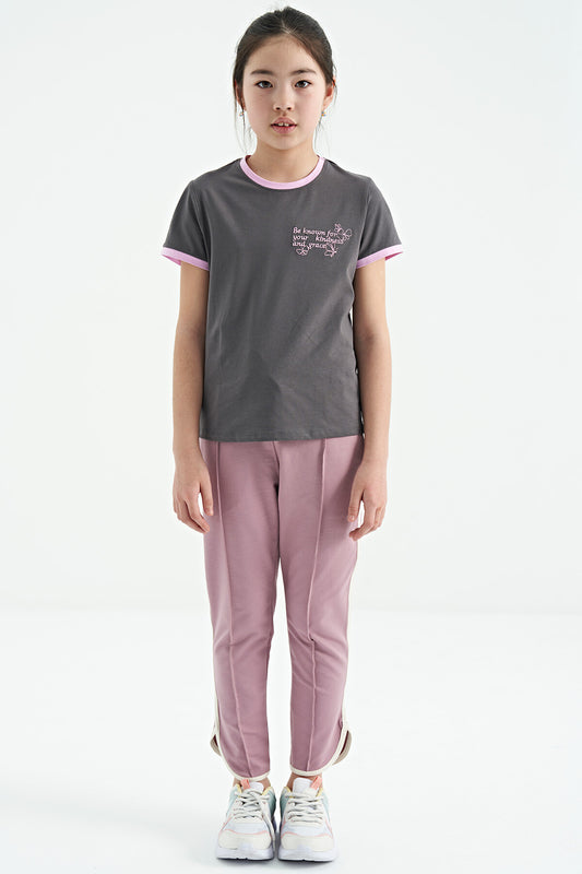 Dark Grey Minimal Print O Neck Comfort Fit Short Sleeve Girls T-Shirt - 75110