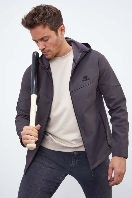 Anthracite Zippered Hooded Water and Wind Resistant Softshell Men's Jacket - 88051