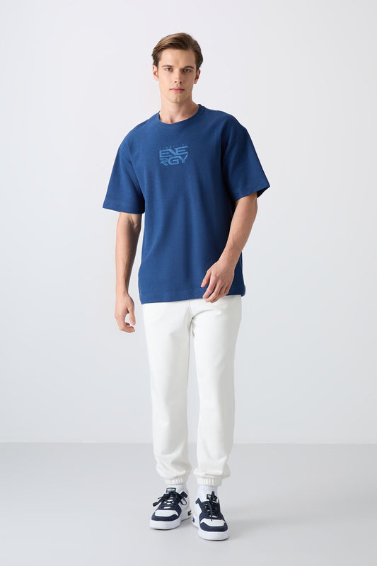 Navy Blue Textured Thick Surface Cotton Oversize Fit Printed Men's T-Shirt - 88366
