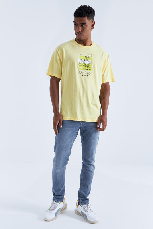 Yellow Print Detailed O Collar Men's Oversize T-Shirt - 88094