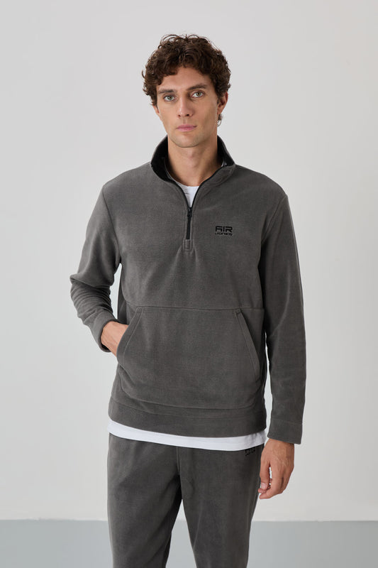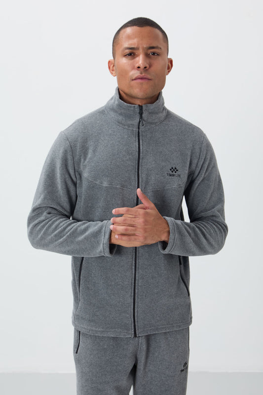 Grey Melange High Collar Basic Zippered Standard Fit Men's Polar Tracksuit Set - 85193