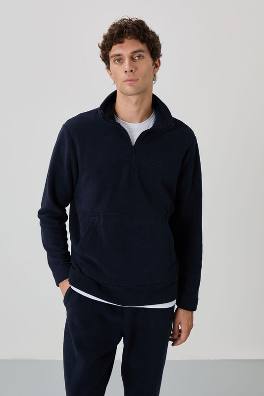 Navy Blue High Collar Basic Zippered Pocket Standard Fit Men's Fleece Tracksuit Set - 85193