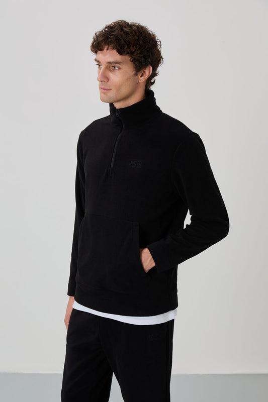 Black Straight Collar Basic Zippered Pocket Standard Fit Men's Polar Tracksuit Set - 85193
