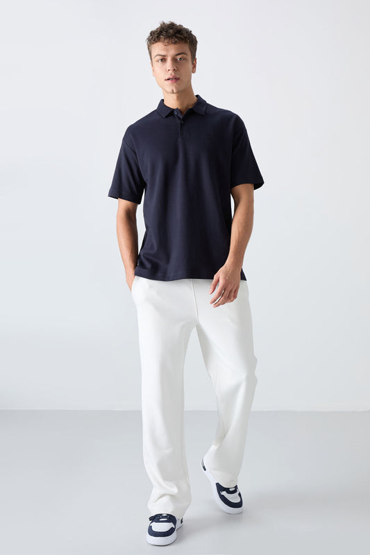 Navy Blue Cotton Thick Soft Textured Oversize Fit Basic Polo Collar Men's T-Shirt - 88327