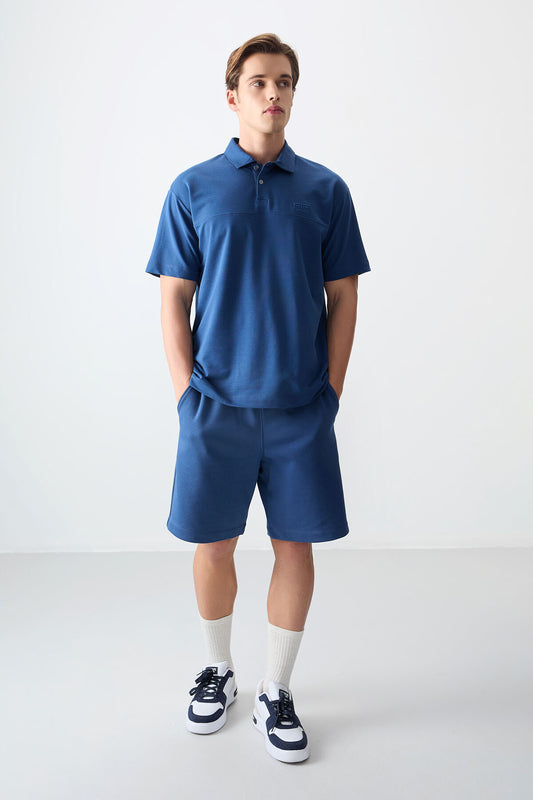 Blue Cotton Thick Soft Textured Polo Collar Oversize Fit Basic Men's T-Shirt - 88382