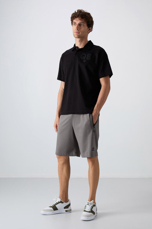 Black Cotton Thick Soft Textured Oversize Fit Printed Polo Collar Men's T-Shirt - 88347