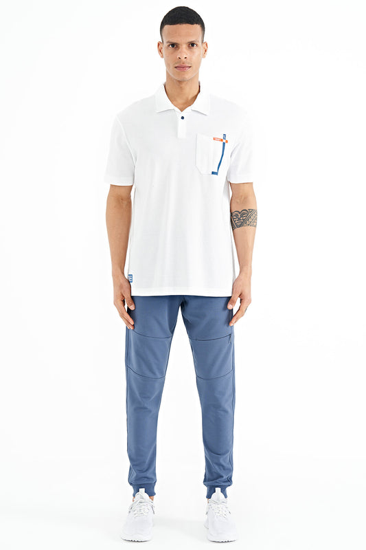 White Embroidered Print Detailed Standard Fit Polo Collar Men's T-Shirt - 88239