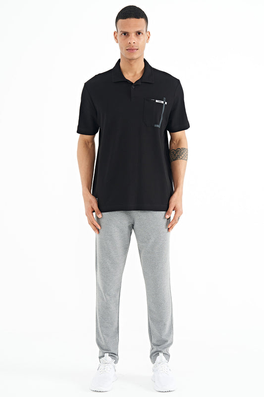 Black Pocket Detailed Printed Standard Fit Polo Collar Men's T-Shirt - 88241