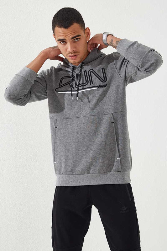 Grey Melange Yarn Embroidered Standard Fit Hooded Men's Sweatshirt - 87887