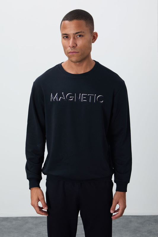 Navy Blue Embroidered O Neck Comfort Fit Polar Lined Men's Sweatshirt - 88020