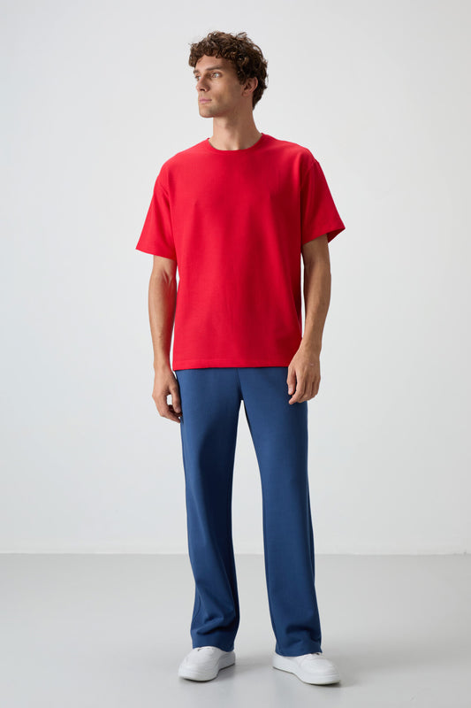 Red Waffle Interlock Textured Surface Oversize Fit Basic Men's T-Shirt - 88379