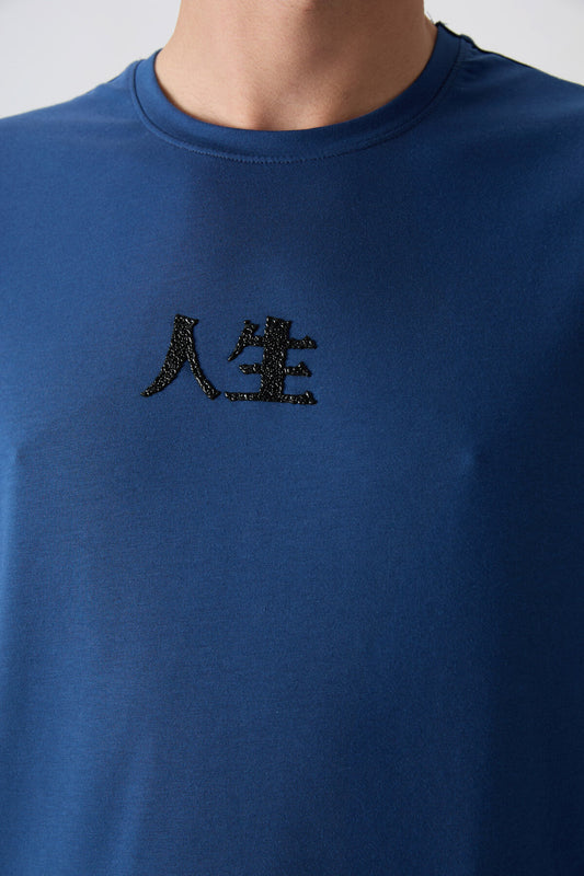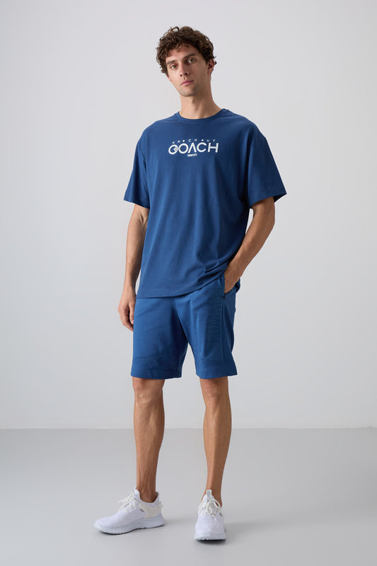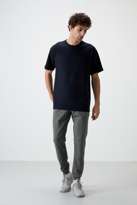 Navy Waffle Interlock Textured Surface Oversize Fit Basic Men's T-Shirt - 88379