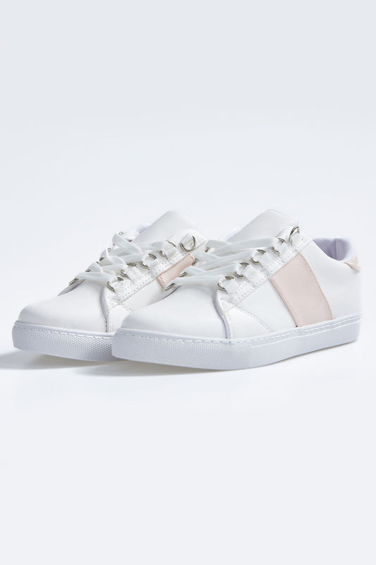 White - Pink Laced Ribbon Detailed PU Leather Women's Sports Shoes - 89202