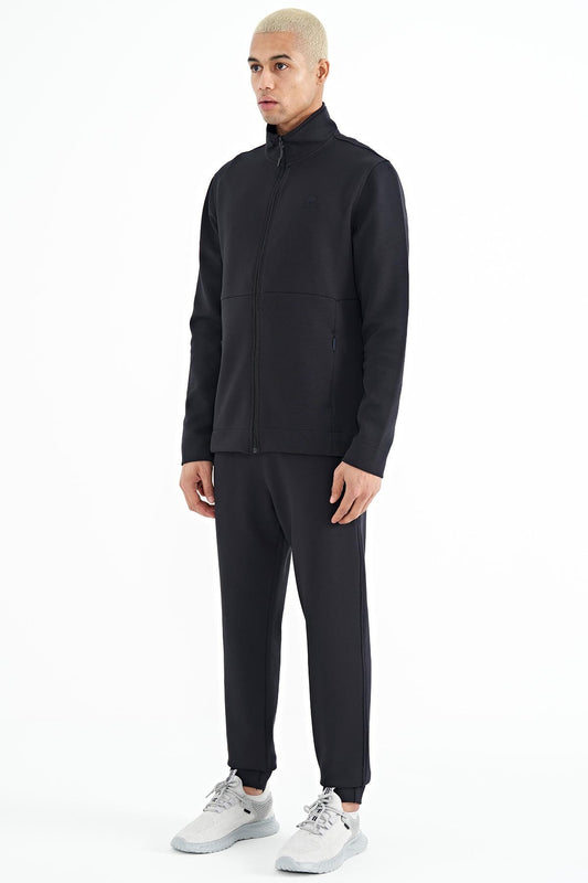 Navy Blue Logo Embroidered Stand-Up Collar Zippered Hidden Pocket Detailed Men's Tracksuit Set - 85201