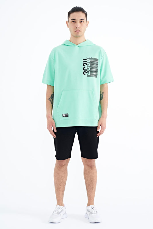 Forest Green Printed Hooded Kangaroo Pocket Oversize Men's T-shirt - 88196
