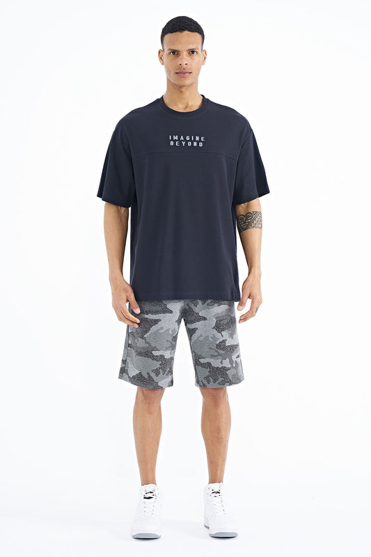 Navy Blue Embroidered Oversize O Collar Men's T-Shirt - 88178