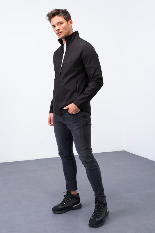 Black Zippered High Collar Water and Windproof Softshell Men's Jacket - 88050