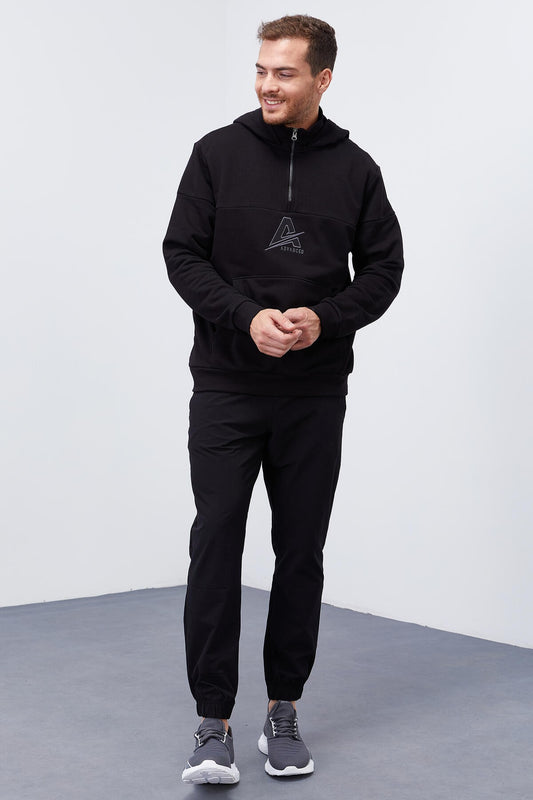 Black Embroidered Half-Zip Hooded Regular Fit Men's Fleece Sweatshirt - 87996