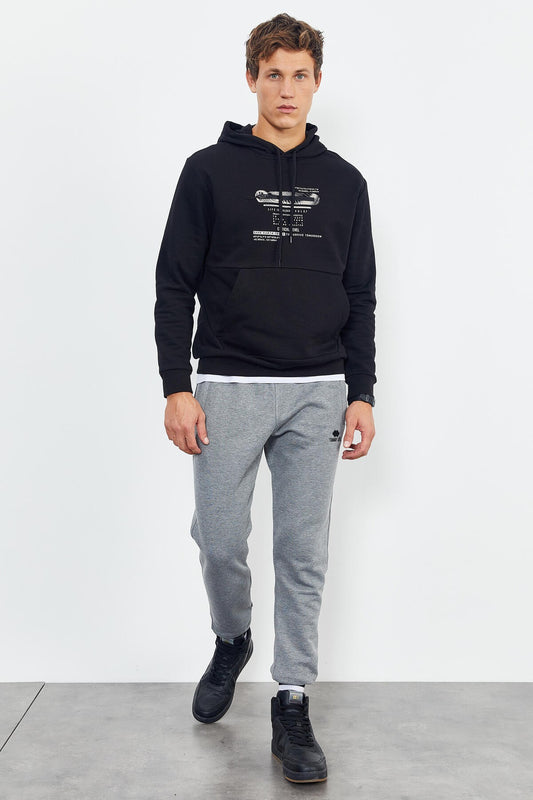 Black Printed Hooded Kangaroo Pocket Comfort Fit Men's Sweatshirt - 88019