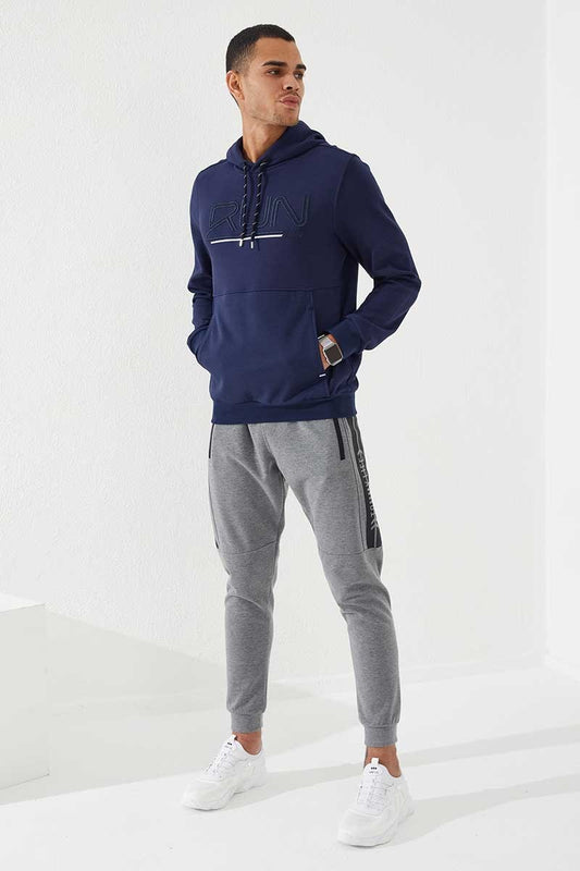 Navy Blue Embroidered Standard Fit Men's Hooded Sweatshirt - 87887