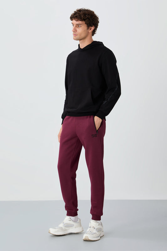 Black Cotton Thick Fleece-Lined Soft Textured Oversize Embroidered Men's Tracksuit Bottom -82146
